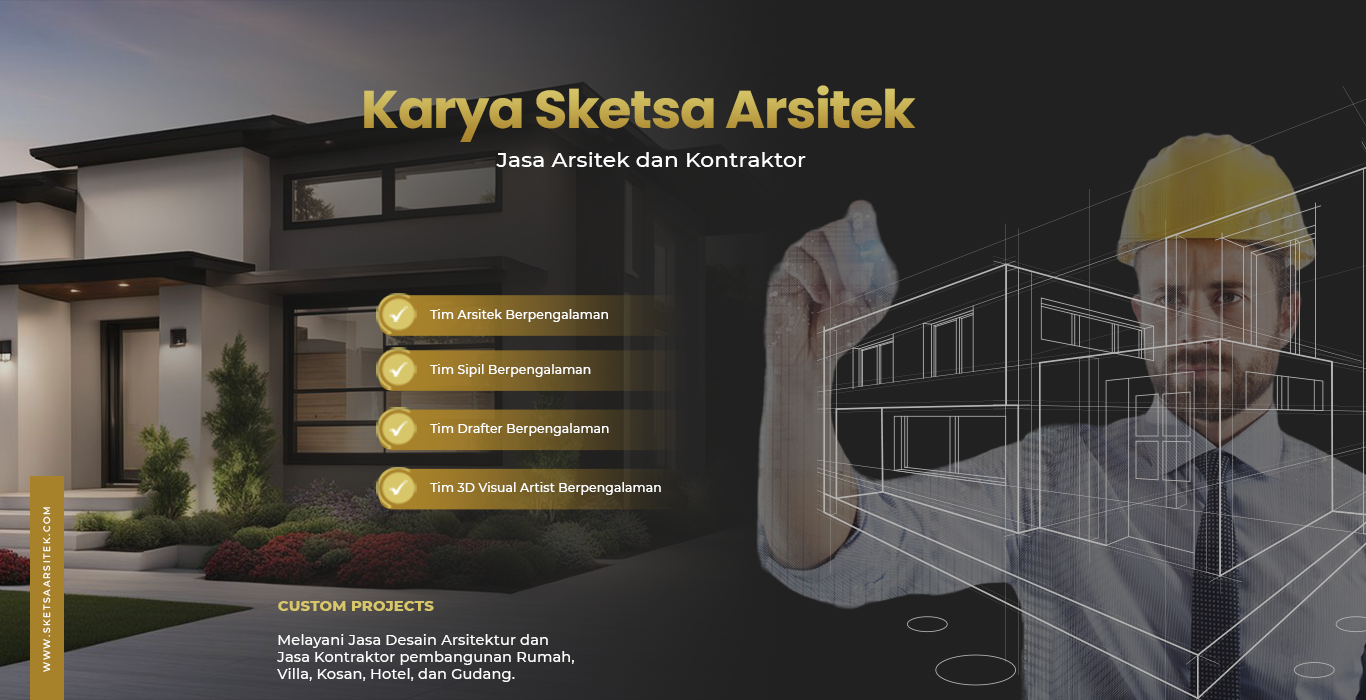 Karya Sketsa Arsitek melayani Jasa Desain Arsitektur dan Jasa Kontraktor pembangunan Rumah, Villa, Kosan, Hotel, dan Gudang. Anda mendapatkan desain yang original dan lengkap sesuai dengan kebutuhan Anda dan dikerjakan oleh Tim Arsitek, Sipil, Drafter, 3D Visual Artist yang berpengalaman & terpercaya sehingga desain sesuai dengan yang anda harapkan.